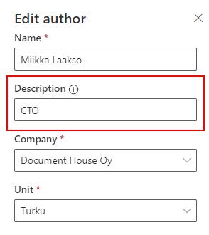 End-user can now give free description for author. Description is shown below author name in author listings to distinct authors with same name but e.g. with different role.