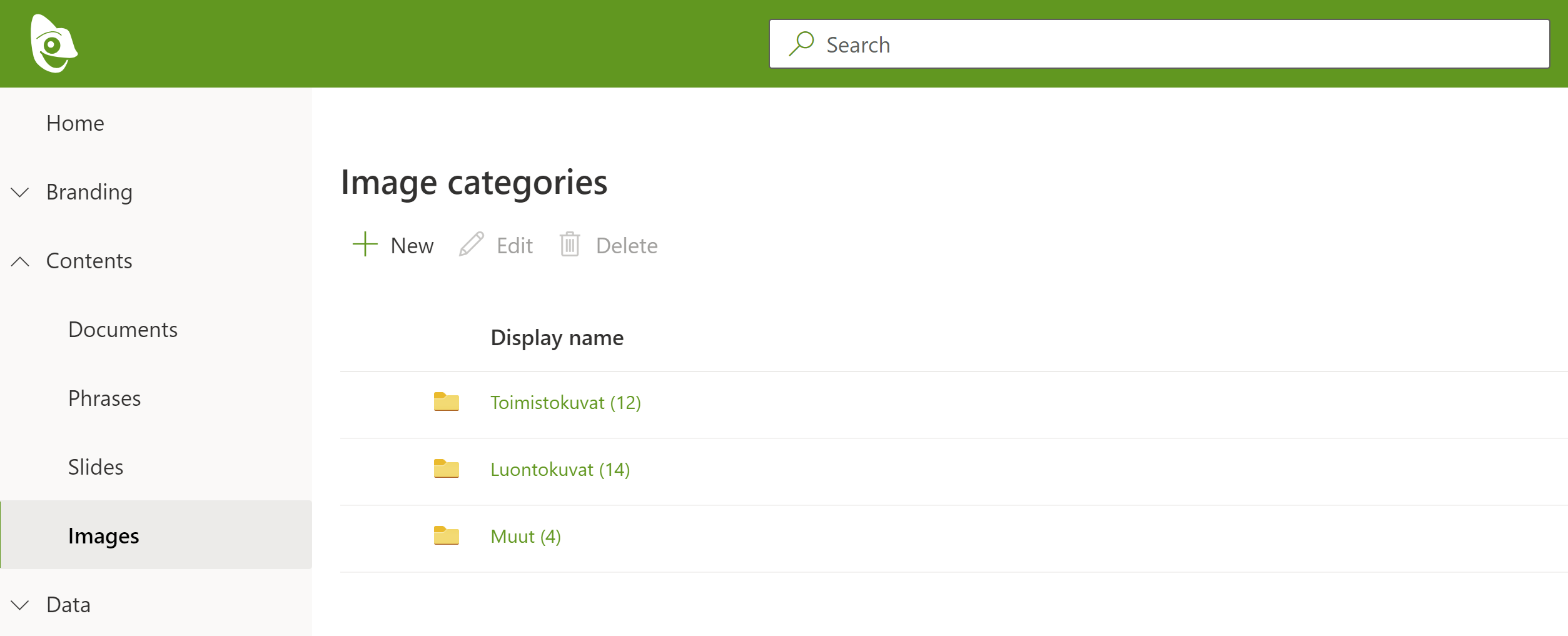 If you don’t have existing categories, create a new category by pressing the new button and giving it a display name. This name will also be shown inside the Kameleon office add-in.