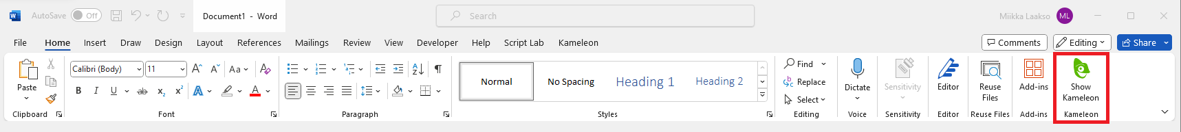 Kameleon task pane can be opened from Home-ribbon