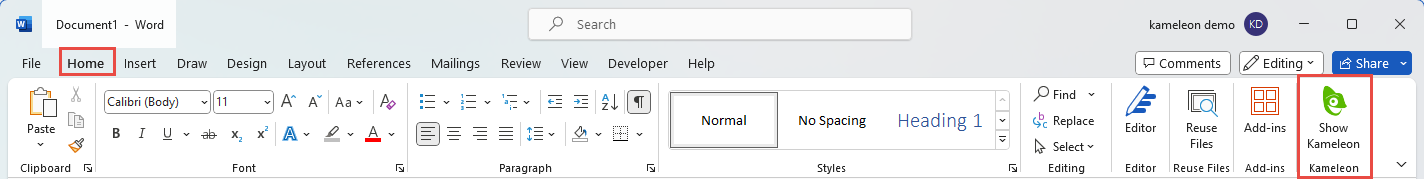 In your MS Office Word, Excel or PowerPoint Kameleon icon is in the end of Home-ribbon.