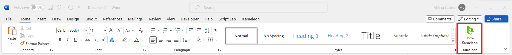 Once application is deployed Kameleon-button should automatically appear in Word, Excel and PowerPoint Home-tab in ribbon as a last button. If however user doesn’t see the Kameleon the following instructions should be followed https://learn.microsoft.com/en-us/microsoft-365/troubleshoot/access-management/user-not-seeing-add-ins